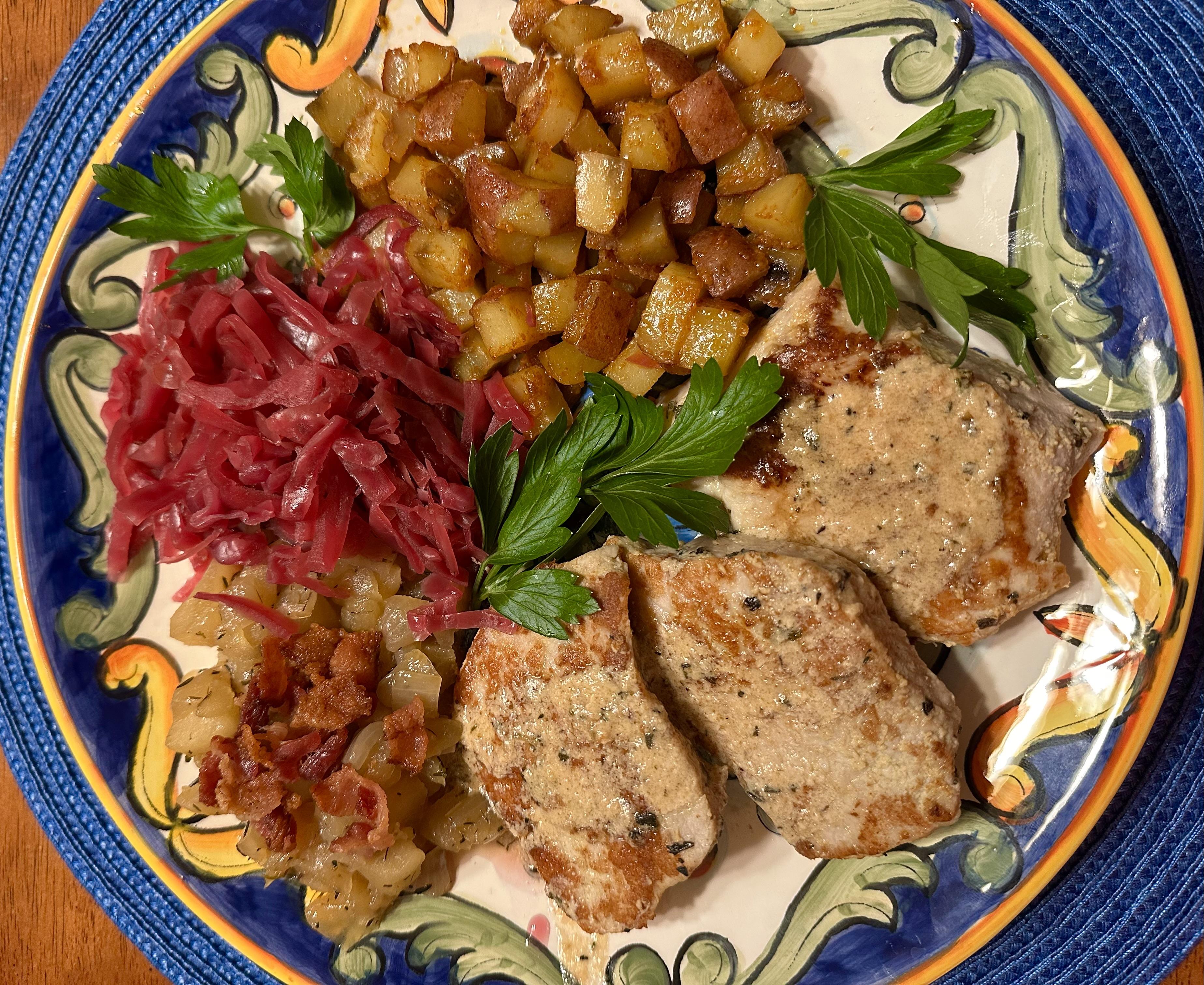 Tender pork medallions dressed with toothsome gravy, oven-roasted organic gold potatoes, caramelized apple onion bacon cubes, nestled besdie a zippy sweet-sour side of red cabbage that's great on its own or as an accompaniment to any item on the plate.